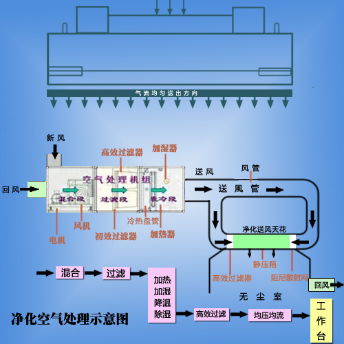 外氣先通過MAU(外氣進行首次過濾)進入無塵室頂部,再通過FFU(二次過濾)將風送進無塵室內,送下來的風通過高架地板,再進入回風箱送到無塵室頂部。