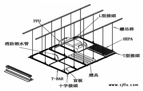 FFU風(fēng)機(jī)吊頂龍骨系統(tǒng)是指用鋁合金做成的,用于潔凈室天花吊頂?shù)闹鞑牧希ㄟ^螺桿與鋁合金相接,用來固定FFU。適用于局部層流系統(tǒng)、FFU系統(tǒng)和不同潔凈級別的空氣凈化系統(tǒng)。