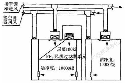 此方式的缺點是設置循環風機箱及處理噪聲,需要較大的空間,而通常百級區周圍風管都比較密集,需要精心布局。此方式百級區上部靜 壓箱相對百級區室內為正壓,頂棚高效過濾器與吊架間的滲漏,為靜壓箱流向室內,直接影響百級區潔凈度。對施工質量要求較高。(具 體可參考: