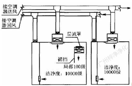 百級層流罩如何設計藥品生產廠房潔凈車間內,經常會有局部百級區,或要求某一個房間或幾個房間為百級,或要求某個房間內部分區域為百級,這些百級區面積一般都不大,從幾十平方米到幾平方米甚至零點幾平方米不等,通常為一個潔凈區內工藝流水線的一部分,但它們在潔凈廠房中都有著非常重要的作用。它們往往是該車間工藝流程的核心部位,比如無菌藥品注射劑的灌封、分裝、壓塞、生物制品的灌封、凍干、加塞等部位,百級區能否正常運行,直接影響到產品質量。下面結合藥品生產廠房潔凈車間的特點,介紹幾種百級區的作法。
