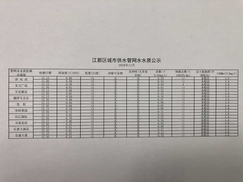 2018年12月江都區城市供水管網水水質公示