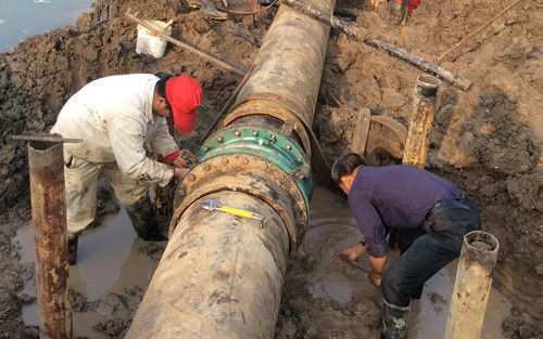 經實地勘查,因支撐土層被挖空后塌陷,造成近60米長的DN500供水主管分節(jié)脫落,真武鎮(zhèn)油田管轄區(qū)范圍大面積停水,幾萬群眾的正常生產、生活用水受到影響,情況十分緊急。區(qū)自來水公司協助油田水廠根據現場情況,以最大程度縮短搶修時間、及早恢復供水為目標,綜合分析比對各種施工方法,科學制定了維修方案,并協助安排接水點,供油田消防車應急送水。經過相關施工準備后,搶修人員按照既定方案,迅速投入維修作業(yè),組織對脫落的管道進行退拔,采用平承平插工藝對脫落的供水管道進行重新定位、碰接。搶修人員頂著烈日連續(xù)作戰(zhàn),于下午5:00左右順利完成施工,使當地供水得到及早恢復。