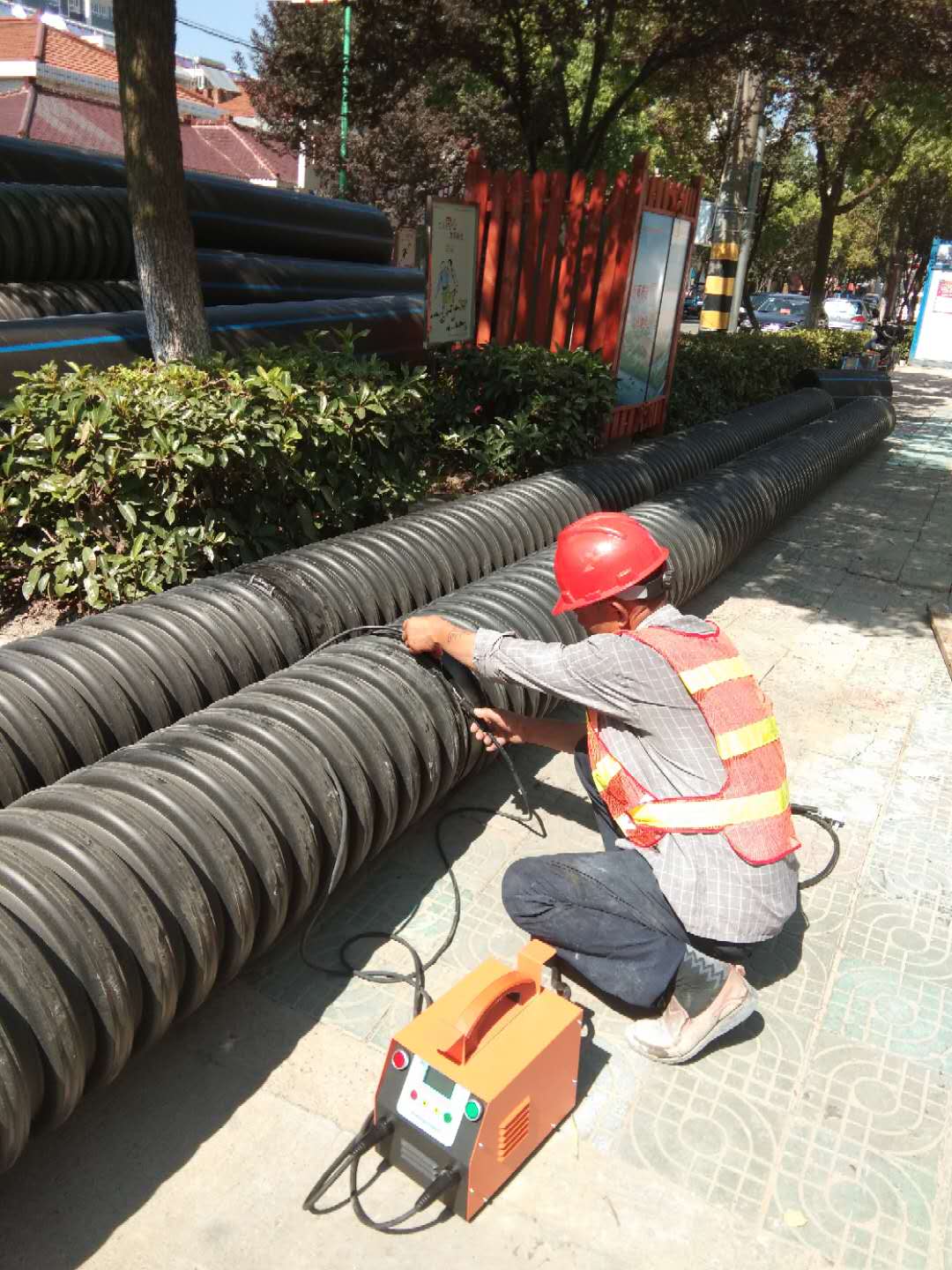 圖為:烈日下,管道安裝工在新區南苑路進行污水管道焊接。