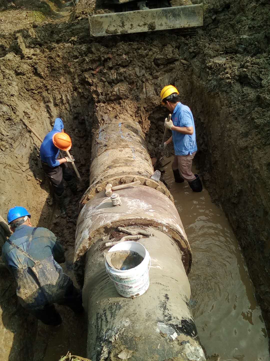 圖為:管道維修工人頭頂烈日,并搶時爭速,在泥水中搶修237省道通揚運河段DN800主管網。