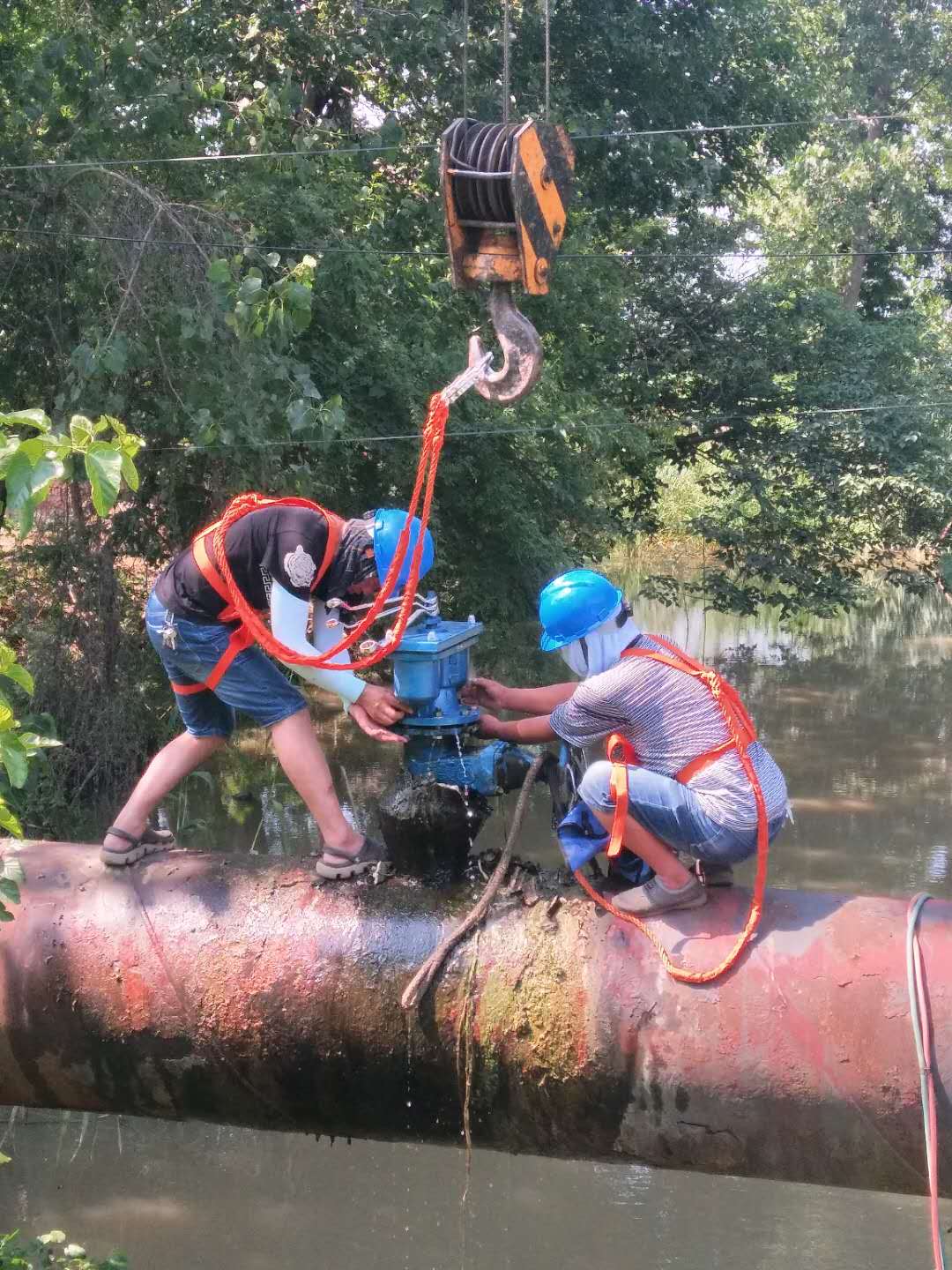 圖為:烈日下,供水一線的安裝維修工人為仙女鎮航空路與江平路的交叉口DN150管道更換排氣閥,確保夏季高峰期的安全優質供水。