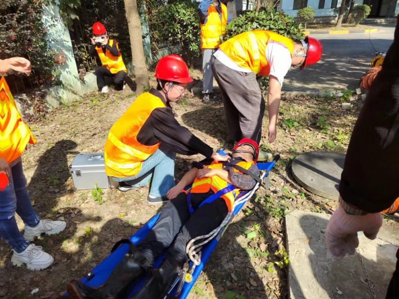 現(xiàn)場(chǎng)后勤保障組放置救援三腳架、使用鼓風(fēng)機(jī)進(jìn)行通風(fēng)作業(yè),同時(shí)拉警戒線,疏散人員;搶修組穿戴救援繩、佩戴呼吸器、攜帶救援繩下井救人;救援組抬擔(dān)架、挎醫(yī)藥箱在閥門井口等待......現(xiàn)場(chǎng)演練緊張有序,隨著傷員被救出閥門井,放上擔(dān)架、轉(zhuǎn)移至通風(fēng)空曠處,展開現(xiàn)場(chǎng)救護(hù)工作,直至救護(hù)人員到達(dá),此次演練活動(dòng)取得圓滿成功。