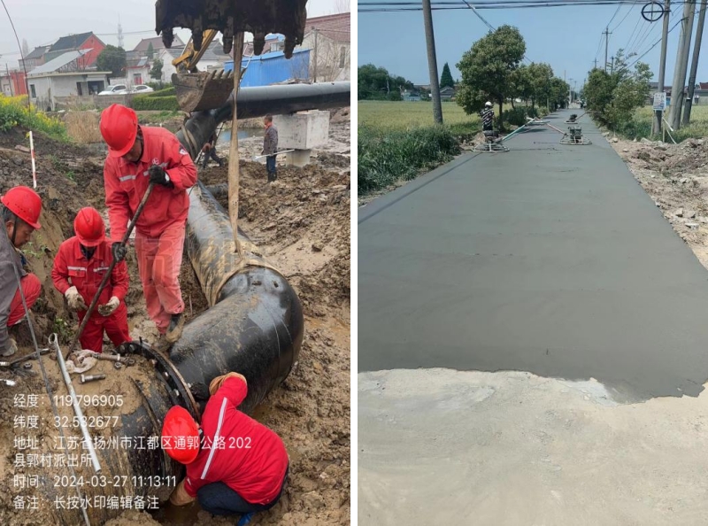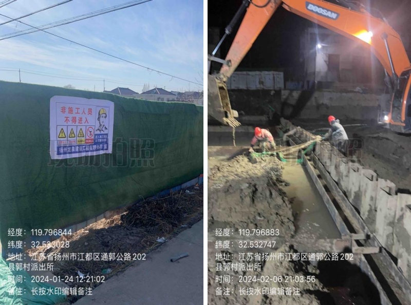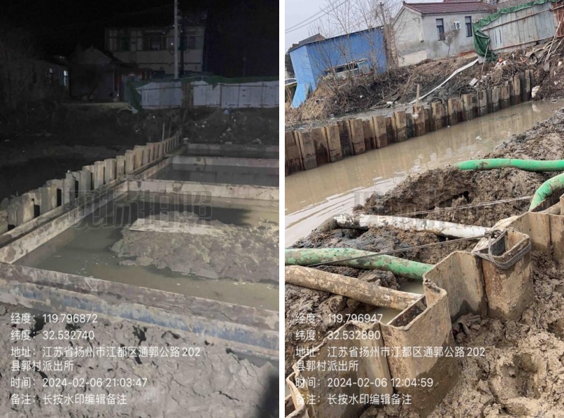 在施工過程中,東側(cè)原造橋壩頭設(shè)置過高,上游自來水漏水嚴(yán)重,挖機(jī)無法進(jìn)場施工,人工拆除兩道壩頭。施工總體步驟:草袋圍堰支護(hù),支護(hù)內(nèi)明排水,靜壓打樁,圍堰施工,開挖,管道維修,管道打壓,回填,鋼板樁拆除,圍堰拆除。
